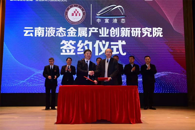 云南中宣液態金屬科技有限公司與昆明理工大學簽訂《云南液態金屬產業創新研究院共建合作協議》。與會嘉賓共同按下水晶球,標志著云南液態金屬產業創新研究院正式成立。