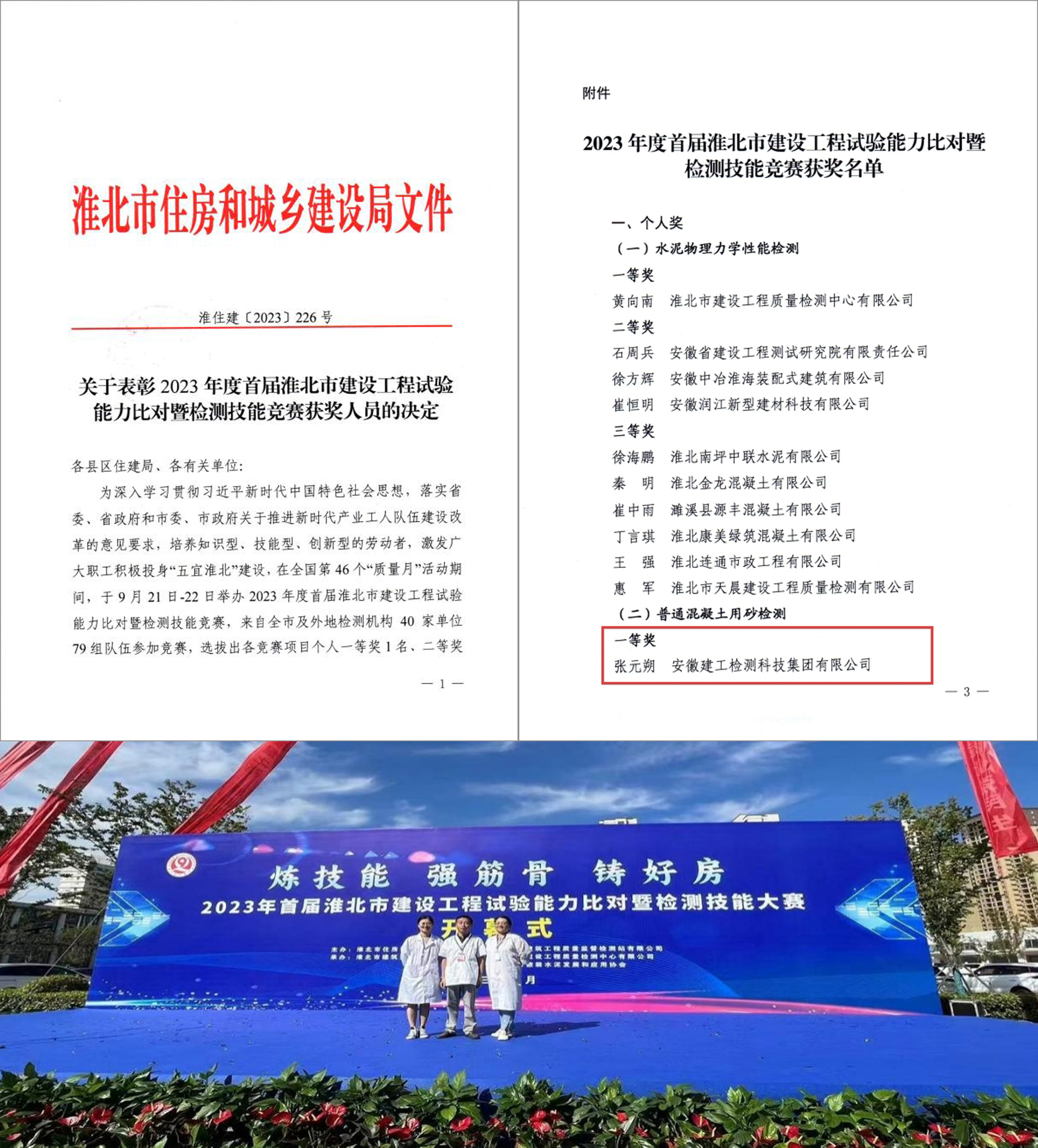 喜訊!建工檢測員工榮獲首屆淮北市建設(shè)工程試驗?zāi)芰Ρ葘︳邫z測技能競賽個人一等獎