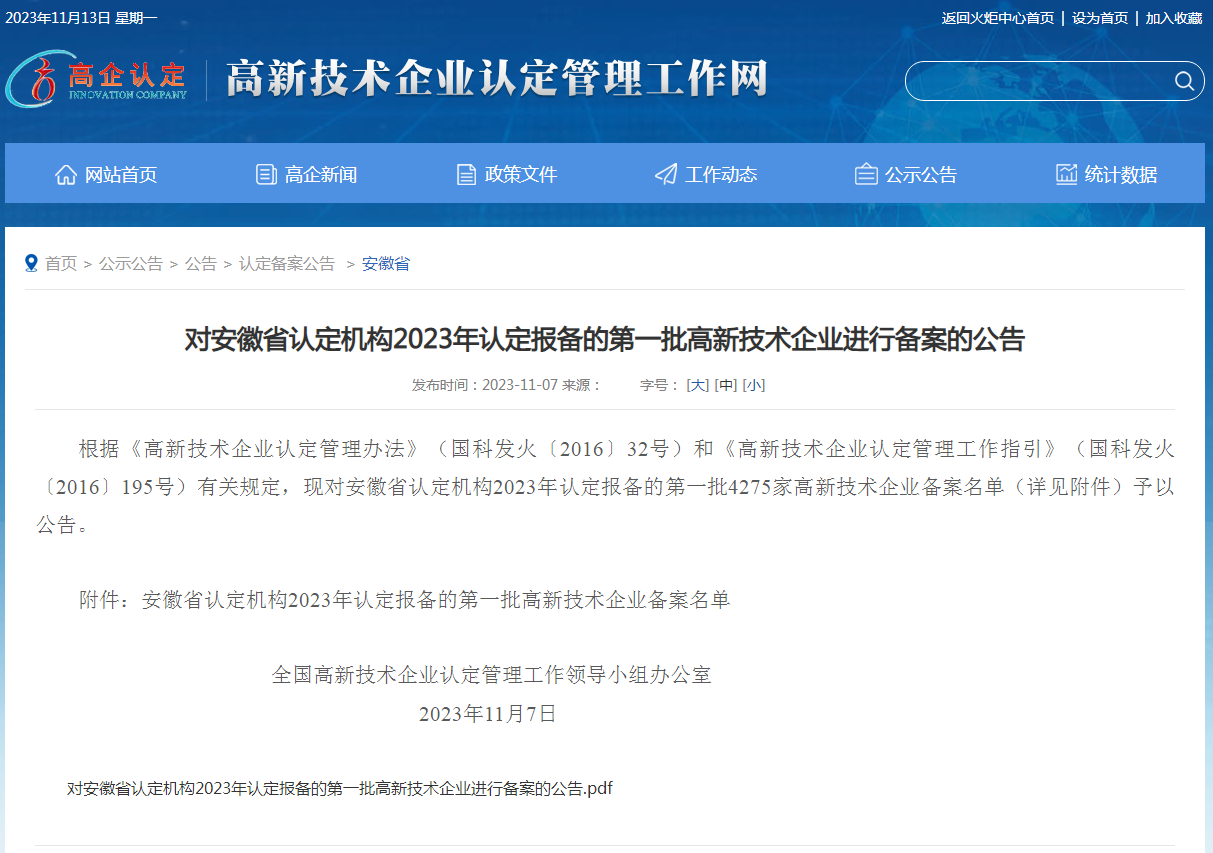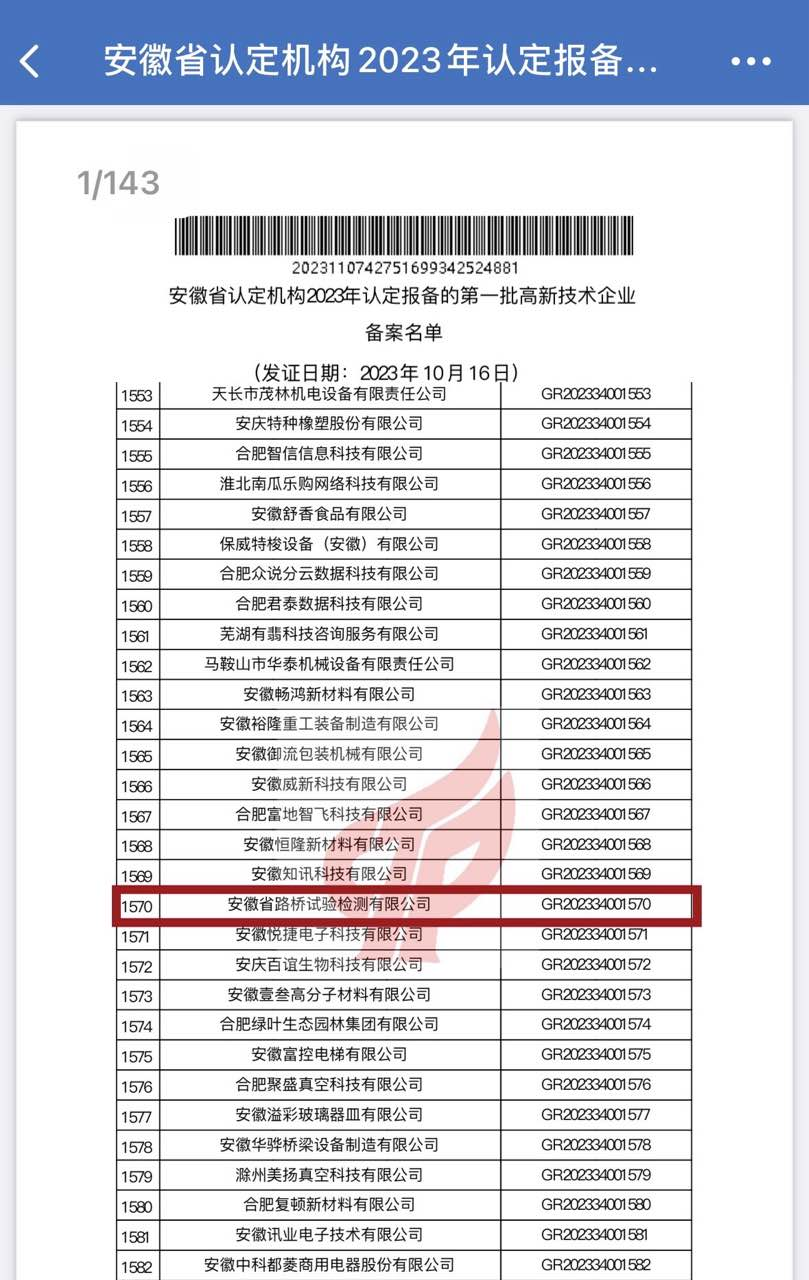 11月7日,全國高新技術(shù)企業(yè)認定管理工作領(lǐng)導(dǎo)小組辦公室發(fā)布的安徽省認定機構(gòu)2023年認定報備的第一批高新技術(shù)企業(yè)備案的名單中,安徽省路橋試驗檢測有限公司赫然在列,這標志著我公司再次成功獲得國家高新技術(shù)企業(yè)認定。
