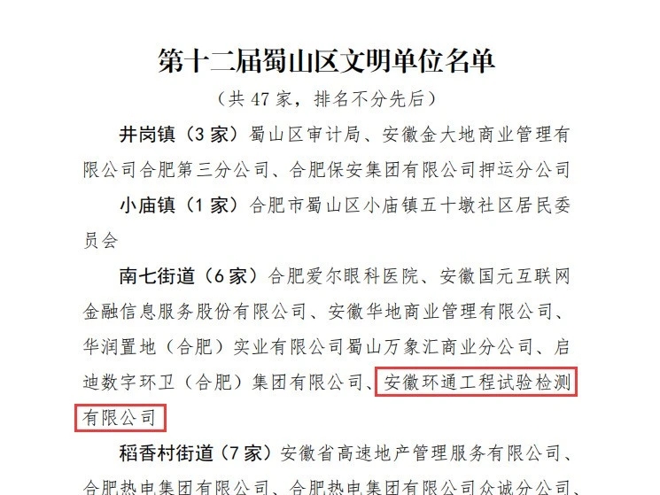 喜報二:近日,蜀山區(qū)文明委印發(fā)《關(guān)于表彰第十二屆蜀山區(qū)文明單位的通報》,環(huán)通公司榮獲“蜀山區(qū)文明單位”稱號。