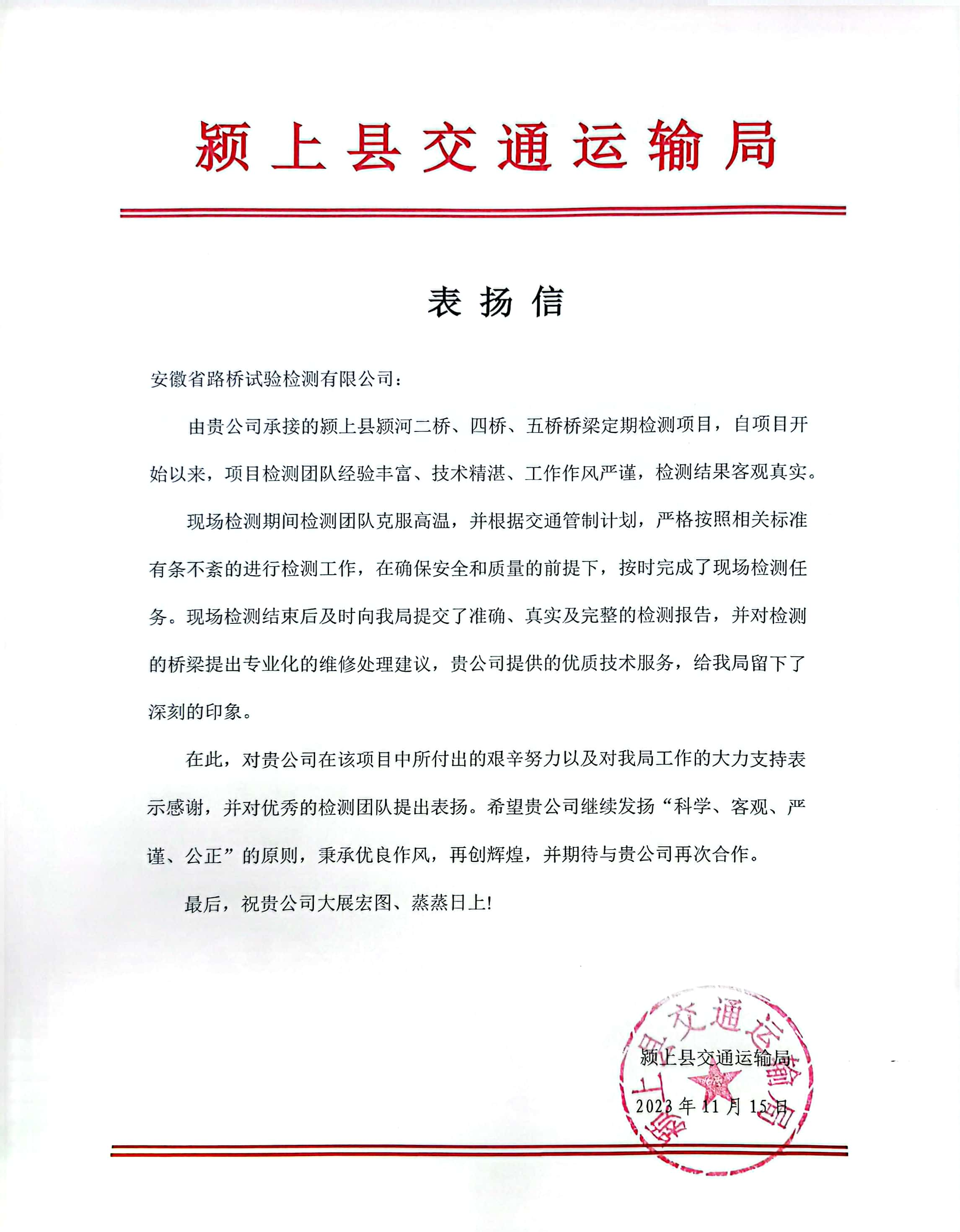 近日,安徽省路橋試驗(yàn)檢測(cè)有限公司收到潁上縣交通運(yùn)輸局表?yè)P(yáng)信,對(duì)路橋檢測(cè)公司橋檢團(tuán)隊(duì)高效率完成各項(xiàng)外檢任務(wù),給予充分肯定及書(shū)面表?yè)P(yáng)。