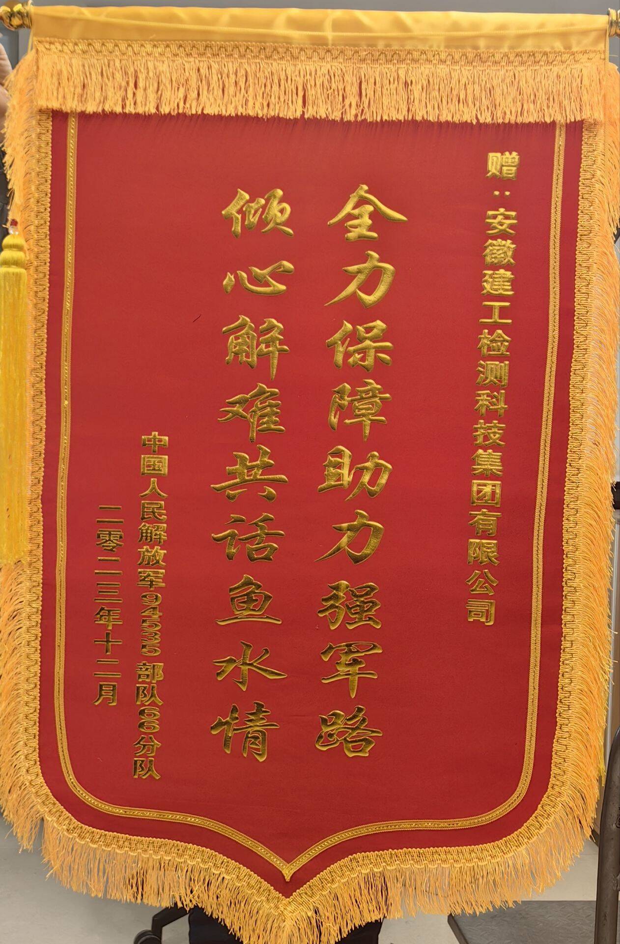 12月10日,中國人民解放軍 94535部隊66分隊將一面印有“全力保障助力強軍路,傾心解難共話魚水情”的錦旗送到了安徽建工檢測,以此感謝建工檢測承接的新站高新區(qū)駐區(qū)部隊營區(qū)內部道路工程檢測項目的高效完工。