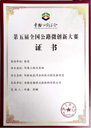 銀獎(jiǎng)!路橋檢測公司榮獲第五屆全國公路微創(chuàng)新大賽獎(jiǎng)項(xiàng)