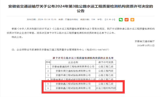 10月14日,安徽省交通運(yùn)輸廳發(fā)布公告,安徽新鑫工程試驗(yàn)檢測(cè)有限公司正式獲批公路工程乙級(jí)和水運(yùn)工程材料丙級(jí)兩項(xiàng)等級(jí)資質(zhì)。