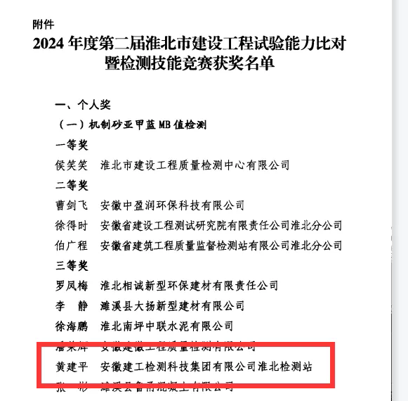 喜報!淮北檢測站榮獲2024年第二屆淮北市建設(shè)工程試驗(yàn)?zāi)芰Ρ葘︳邫z測技能競賽個人三等獎