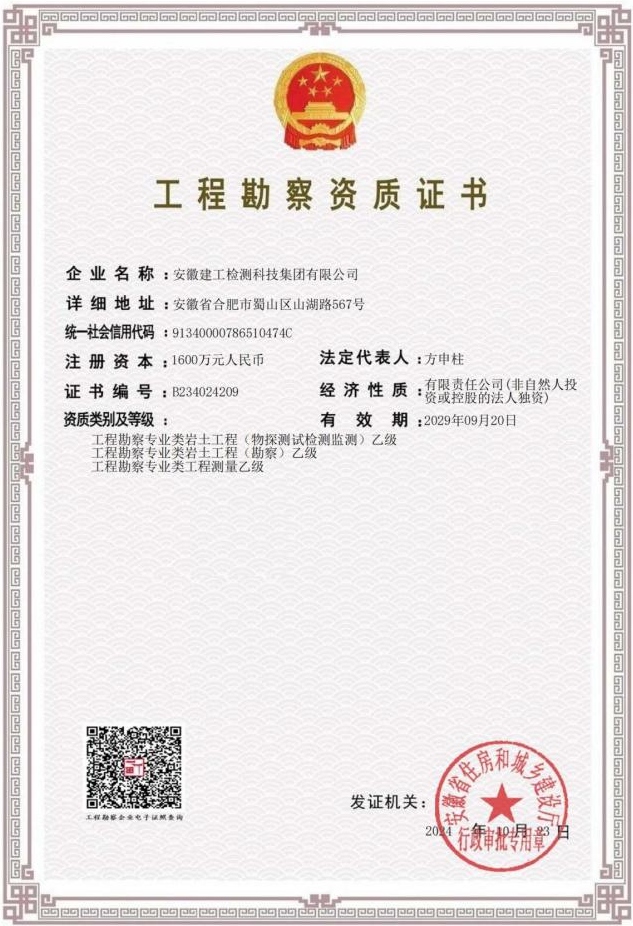近日,安徽建工檢測科技集團有限公司(以下簡稱“建工檢測”)順利通過工程勘察三項乙級資質的延續(xù)核準。