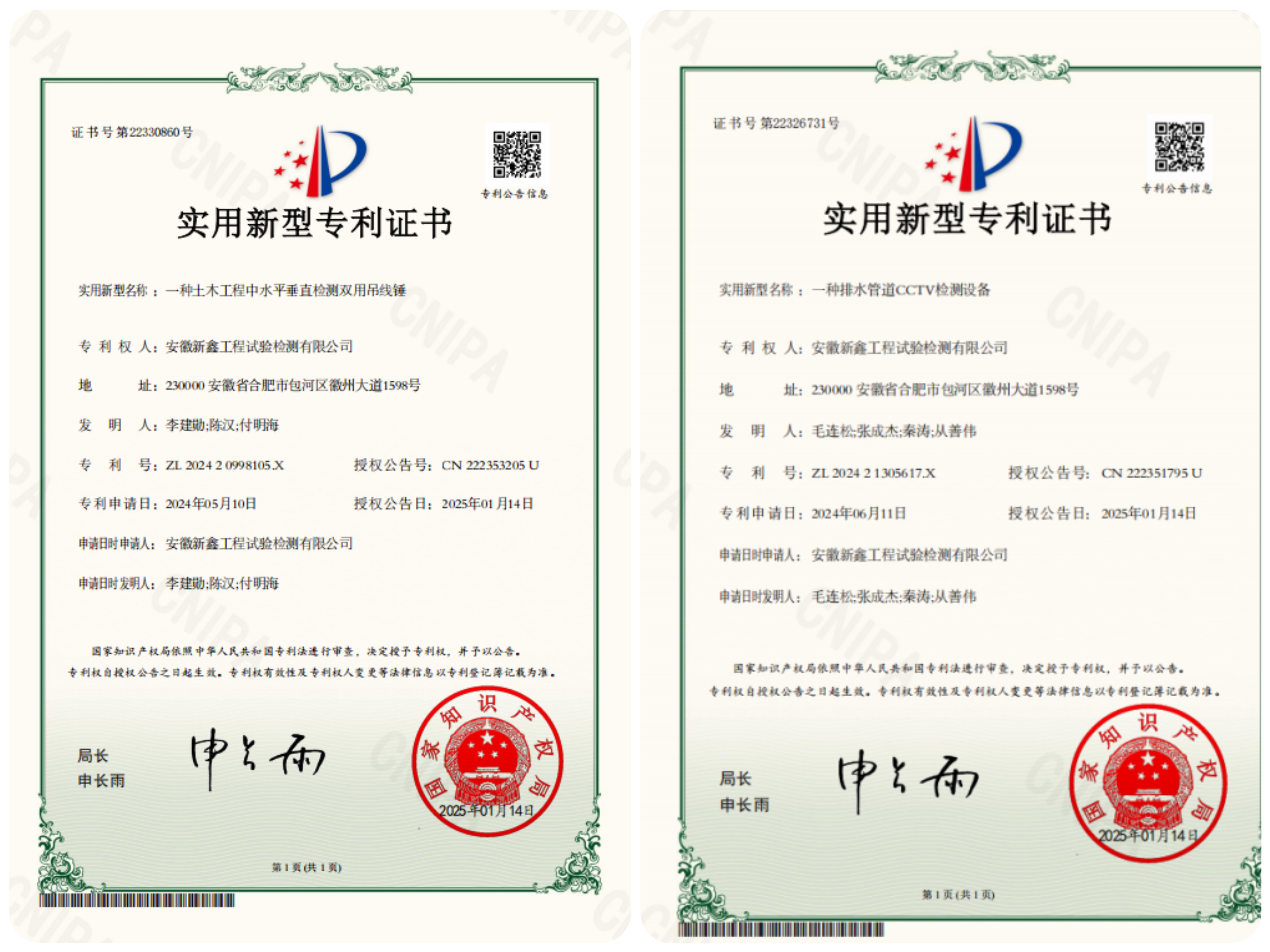 近日,新鑫檢測申請的兩項實用新型專利《一種排水管道CCTV檢測設(shè)備》和《一種土木工程中水平垂直檢測雙用吊線錘》獲得國家知識產(chǎn)權(quán)局授權(quán)。