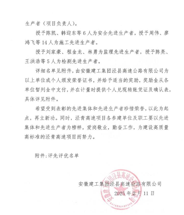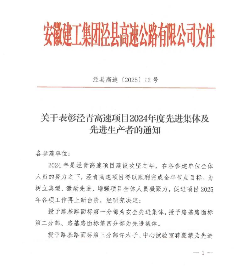 近日,從安徽建工集團(tuán)涇縣高速公路有限公司傳來(lái)喜訊,路橋檢測(cè)宣城至東至高速公路涇縣至青陽(yáng)界段中心試驗(yàn)室蔣蒙蒙等4位同志分別榮獲2024年度先進(jìn)生產(chǎn)者(項(xiàng)目負(fù)責(zé)人)、先進(jìn)生產(chǎn)者(檢測(cè))人員稱(chēng)號(hào)。