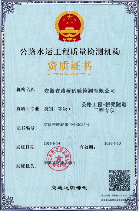 近日,安徽省交通運(yùn)輸廳公布了安徽省2025年第2批公路水運(yùn)工程質(zhì)量檢測機(jī)構(gòu)資質(zhì)審批結(jié)果,路橋檢測新申請的公路工程-橋梁隧道工程專項(xiàng)資質(zhì)順利獲批!