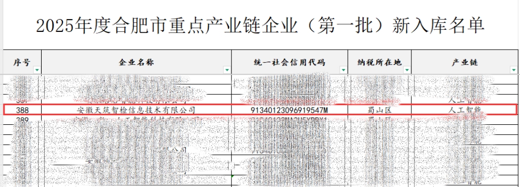 喜報(bào)!天筑智檢公司成功入庫2025年度合肥市重點(diǎn)產(chǎn)業(yè)鏈企業(yè)