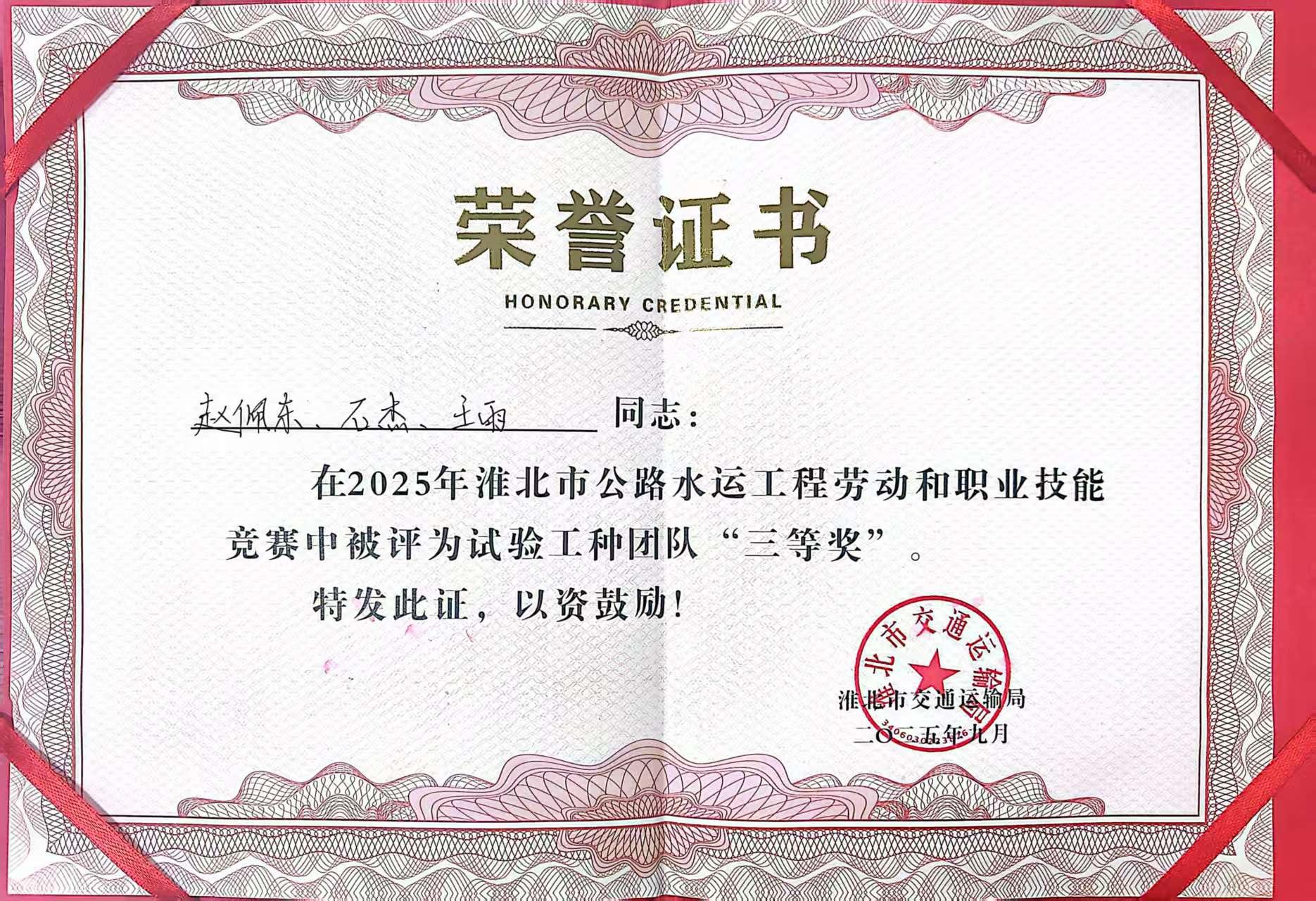 9月24日,2025年淮北市公路水運工程勞動和職業(yè)技能競賽圓滿收官,路港通公司澮河航道整治工程04標項目趙佩東、石杰、王雨三位選手憑借扎實過硬的專業(yè)技能與高效默契的團隊協(xié)作,成功斬獲團隊三等獎 。此次獲獎,既是對公司技能人才培養(yǎng)體系與成果的高度認可,更激發(fā)了全體員工的奮斗熱情。