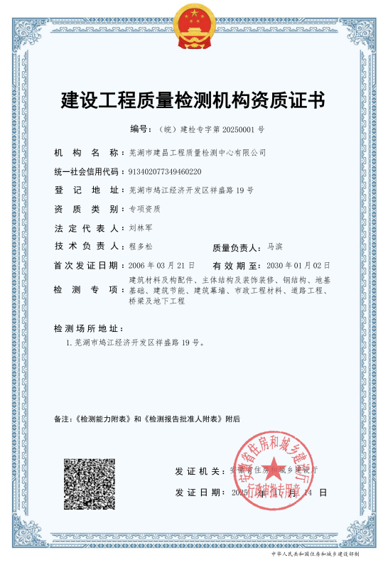 此次新增的兩項(xiàng)資質(zhì),與建昌檢測已具備的建筑材料及構(gòu)配件檢測、主體結(jié)構(gòu)檢測、地基基礎(chǔ)檢測等七大資質(zhì)形成有效互補(bǔ),構(gòu)建起覆蓋房建、市政、道路工程、橋梁與地下工程等建設(shè)工程全領(lǐng)域的檢測能力矩陣。全項(xiàng)資質(zhì)的集齊,不僅為客戶帶來“一站式”服務(wù)新體驗(yàn),客戶無需對接多家機(jī)構(gòu)即可享受全鏈條檢測服務(wù),大幅提升項(xiàng)目推進(jìn)效率,更讓建昌檢測在市場競爭中憑借資質(zhì)疊加優(yōu)勢,得以承接大型綜合體、市政工程、橋梁工程及地下工程等復(fù)雜檢測項(xiàng)目,通過提供定制化檢測服務(wù)進(jìn)一步拓展業(yè)務(wù)邊界,夯實(shí)市場競爭根基。