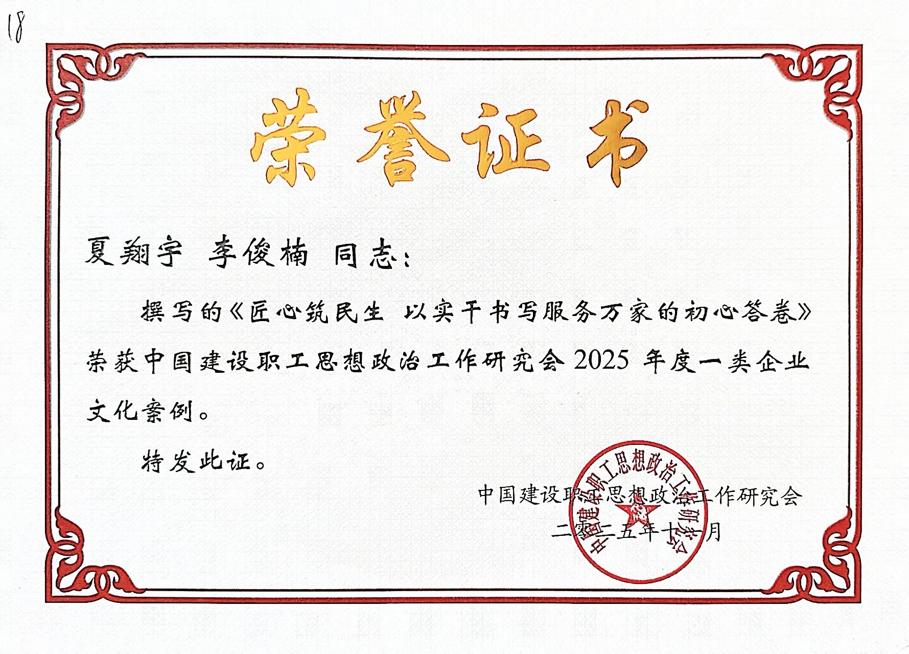 近日,中國建設(shè)職工思想政治工作研究會公布2025年度中國建設(shè)職工思想政治研究會企業(yè)文化案例表彰結(jié)果,公司報送的《匠心筑民生 以實干書寫服務(wù)萬家的初心答卷》獲評一類企業(yè)文化案例。