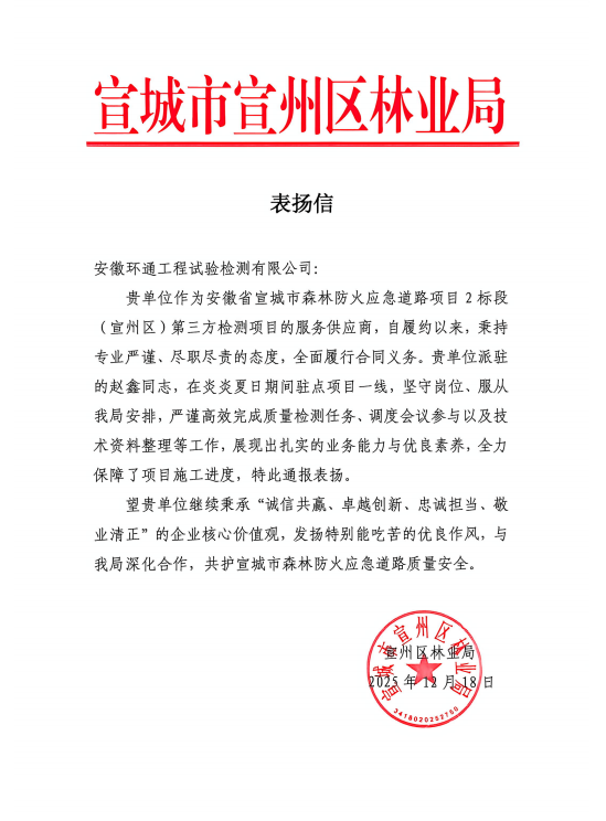 近日,宣城市宣州區(qū)林業(yè)局發(fā)來表揚(yáng)信,對建工檢測公司所屬環(huán)通檢測在宣城市森林防火應(yīng)急道路項(xiàng)目2標(biāo)段第三方檢測工作中所展現(xiàn)的專業(yè)服務(wù)能力及職業(yè)素養(yǎng)給予充分肯定。