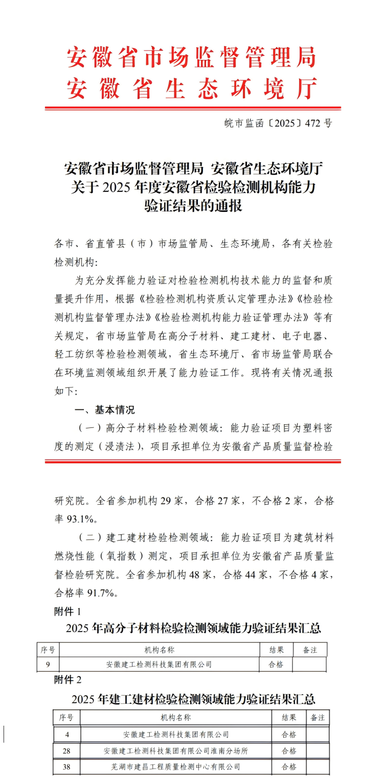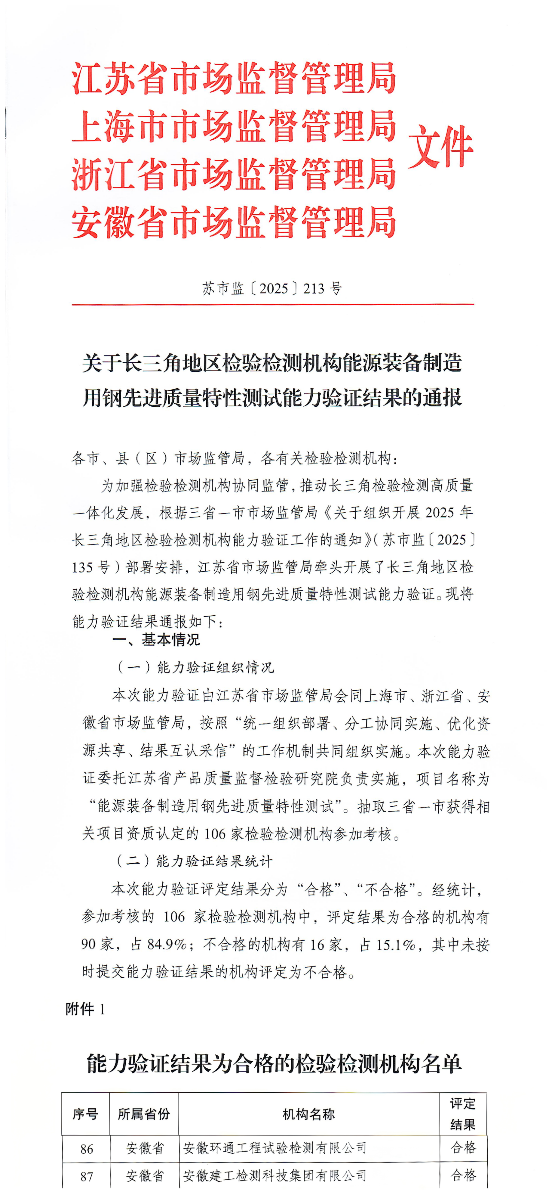 近日,長三角三省一市市場監(jiān)督管理局、安徽省市場監(jiān)督管理局先后通報了2025年度檢驗檢測機構(gòu)能力驗證結(jié)果。建工檢測公司本部、淮南分場所及所屬環(huán)通檢測、建昌檢測在上述各項能力驗證中結(jié)果均為“合格”。