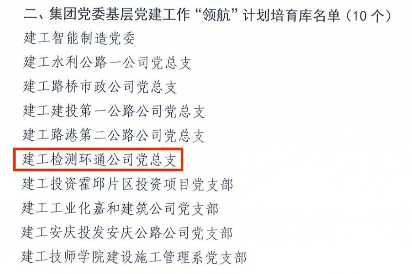 近日,安徽建工集團(tuán)黨委發(fā)布2025年度基層黨建工作 “領(lǐng)航”計(jì)劃入庫(kù)情況通報(bào),環(huán)通檢測(cè)黨總支“五心工作法”黨建品牌成功入選集團(tuán)基層黨建工作“領(lǐng)航”計(jì)劃培育庫(kù)。