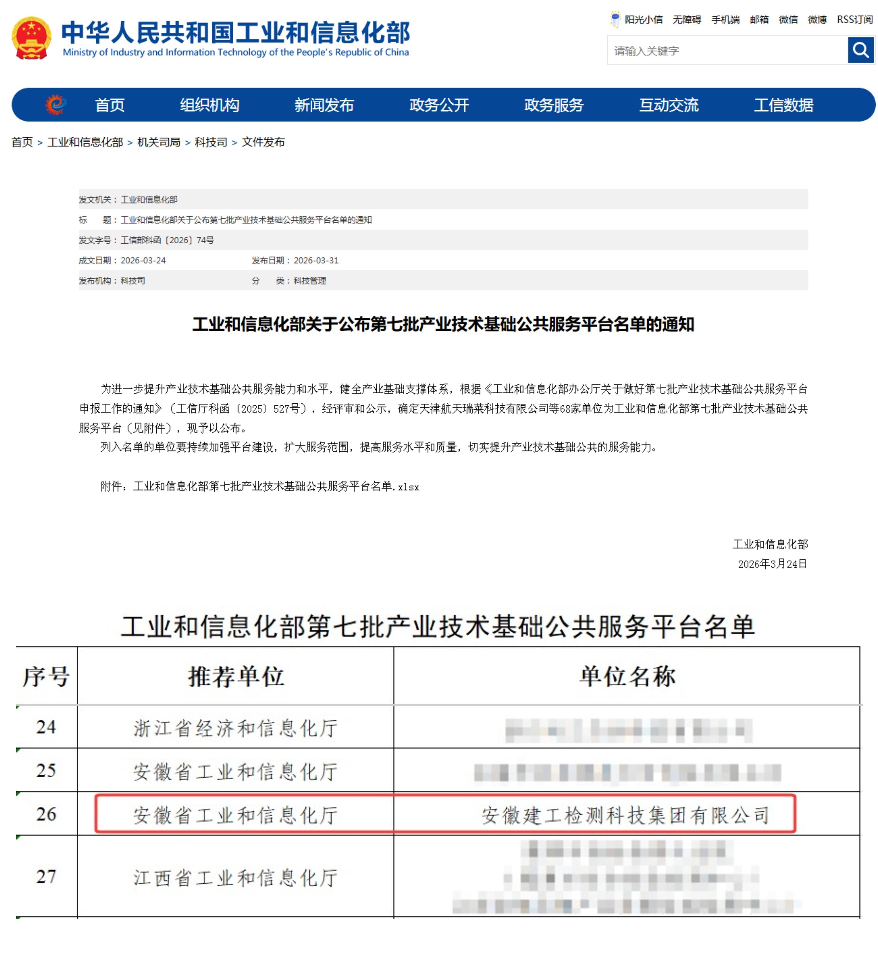 近日,工業(yè)和信息化部正式公布第七批產(chǎn)業(yè)技術(shù)基礎(chǔ)公共服務(wù)平臺名單,建工檢測成功登榜,標(biāo)志著公司的技術(shù)實力、公共服務(wù)能力與行業(yè)影響力獲得國家層面的權(quán)威認(rèn)可。