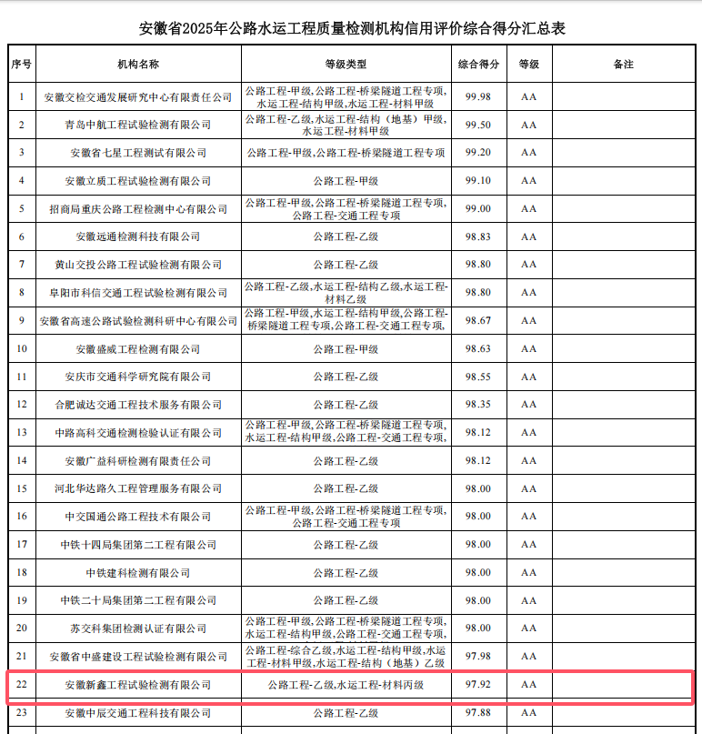 新鑫檢測獲安徽省2025年公路水運工程質(zhì)量檢測機構(gòu)信用AA評級