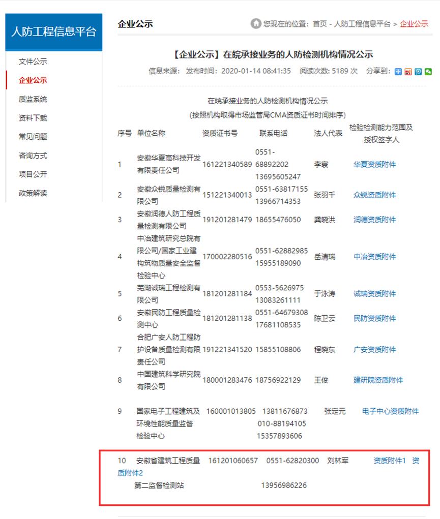 2020年1月15日,經(jīng)安徽省市場監(jiān)督管理局、安徽省人民防空辦公室的聯(lián)合批準(zhǔn)認(rèn)定,二站喜獲人防工程防護(hù)設(shè)備專項(xiàng)檢測資質(zhì),并且成為安徽省內(nèi)首家具備人防工程防護(hù)設(shè)備專項(xiàng)檢測資質(zhì)的建筑工程綜合類檢驗(yàn)檢測機(jī)構(gòu)。