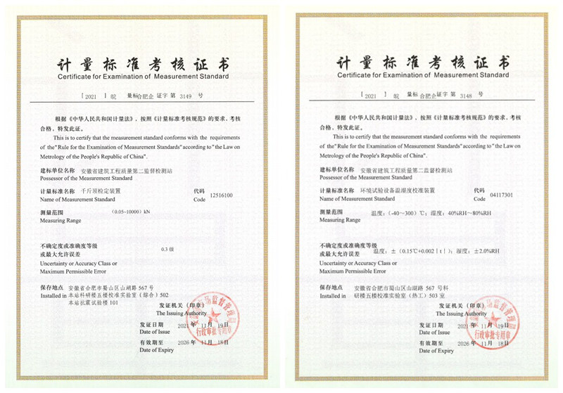 經(jīng)過近一年的積極籌備,近日,二站特檢所順利通過省計量標準考核委員會的現(xiàn)場評審,取得了安徽省市場監(jiān)督管理局頒發(fā)的千斤頂檢定裝置、0.3級測力儀標準裝置、鋼筋保護層、樓板厚度測量儀校準裝置、非自動衡器檢定裝置、環(huán)境試驗設(shè)備溫濕度校準裝置、天平檢定裝置計量標準考核證書。