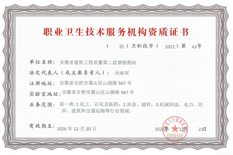 近日,經(jīng)安徽省衛(wèi)健委認(rèn)定,二站順利取得職業(yè)衛(wèi)生技術(shù)服務(wù)機(jī)構(gòu)資質(zhì)證書。