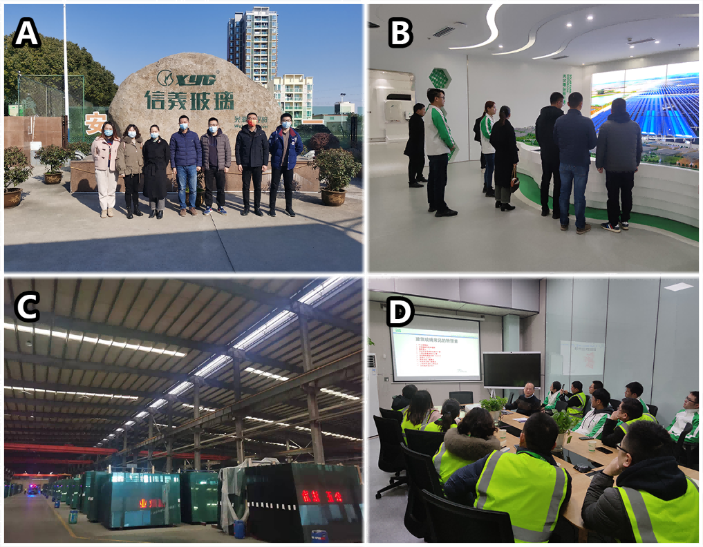((A) 廠區(qū)門口合影;(B) 參觀展廳;(C) 參觀倉庫;(D) 技術(shù)交流)