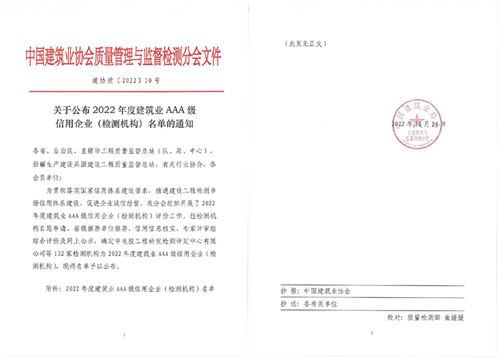 近日,從中國建筑業(yè)協(xié)會傳來喜訊,我站成功獲評“2022年度中國建筑業(yè)AAA級信用企業(yè)(檢測機(jī)構(gòu))”。