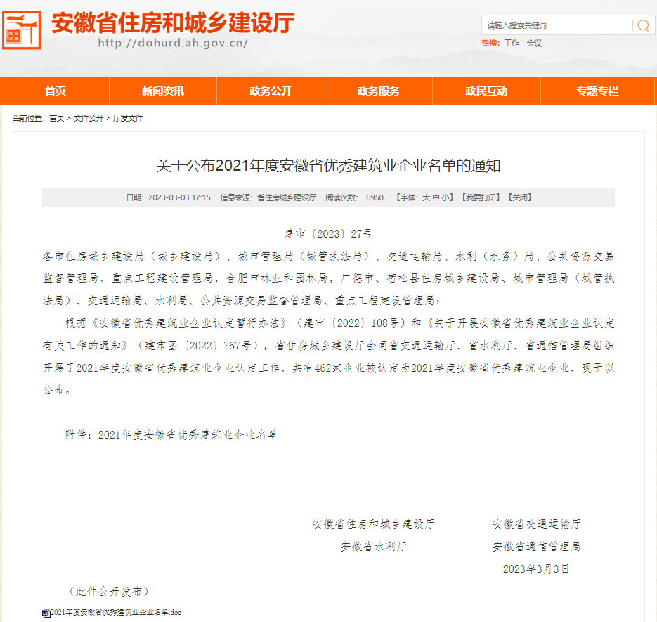近日,省住房和城鄉(xiāng)建設(shè)廳公布“2021年度安徽省優(yōu)秀建筑業(yè)企業(yè)”名單,二站喜獲建筑工程-工程質(zhì)量檢測類“2021年度安徽省優(yōu)秀建筑業(yè)企業(yè)”稱號。
